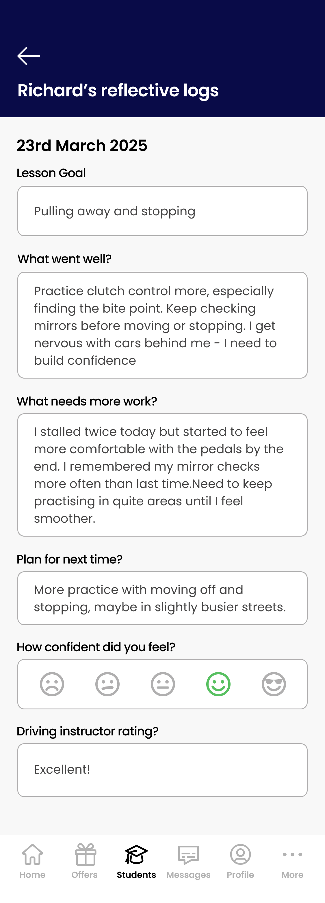 We added logs that allow instructors to quickly record key points after a lesson. These logs were designed based on discussions with instructors and tailored to the needs identified during those interviews. The critical notes entered will also be reflected in the student’s panel.
